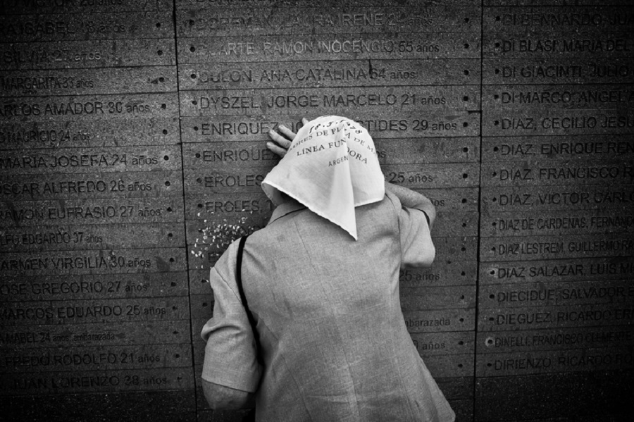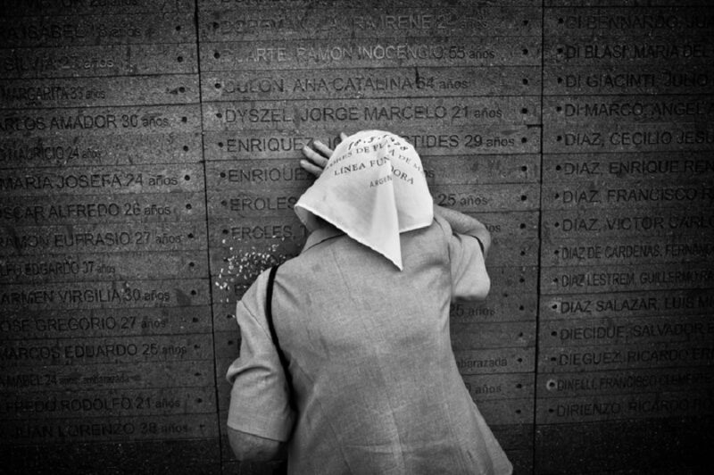 Una Madre de Plaza de Mayo llorando sobre la inscripción del nombre de su hijo sobre el muro del Parque de la Memoria, monumento en homenaje a las víctimas del terrorismo de estado ubicado a lo largo de la costa del Río de la Plata. Buenos Aires, Argentina, 2007. One of the Mothers of Plaza de Mayo cries on her son’s name inscribed on the wall of the Park of Memory, the monument to the victims of state terrorism, located along the coastline of the Río de La Plata river. Buenos Aires, Argentina, 2007.